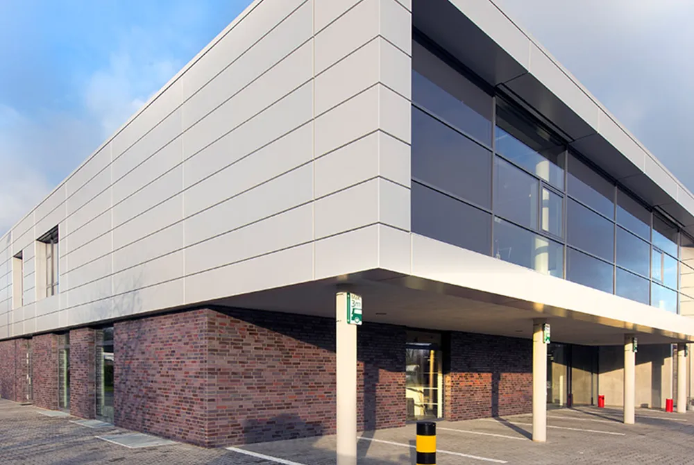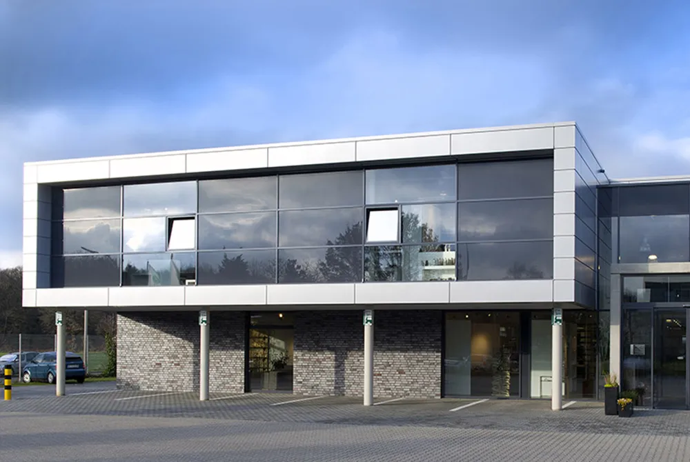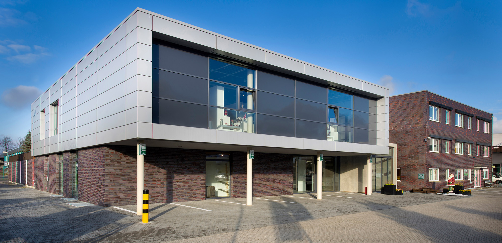 Zweigeschossige Erweiterung für die Firma H.U. Scheulen GmbH, in Mönchengladbach-Wickrath. Im Erdgeschoss des Großhandels wurden die Verkaufs- und Ausstellungsflächen erweitert, im Obergeschoss neue Muster- und Vorbereitungsräume geschaffen.