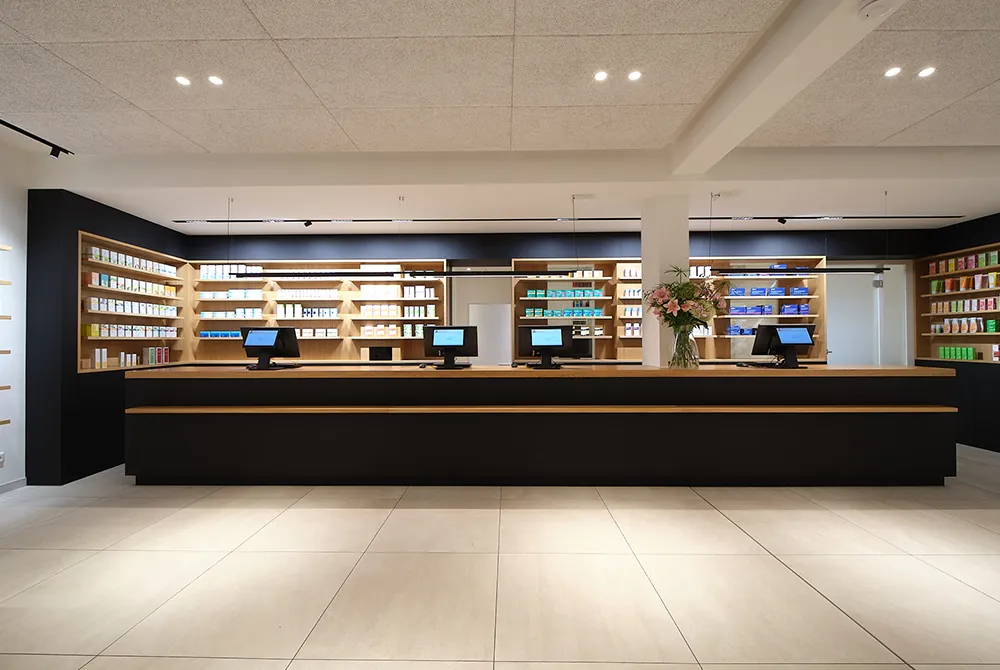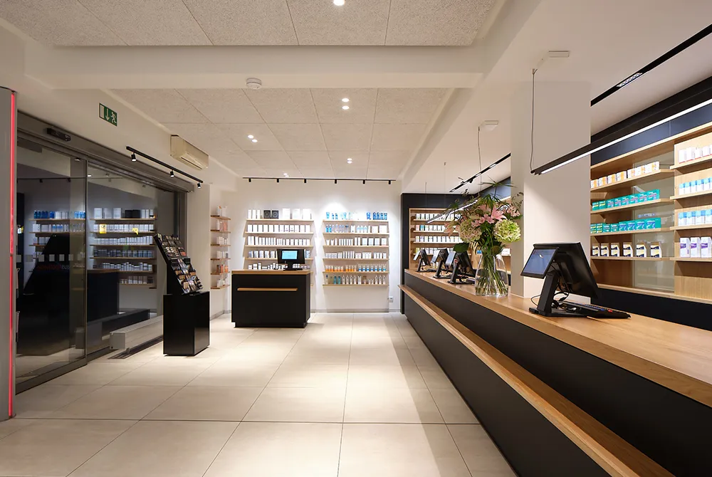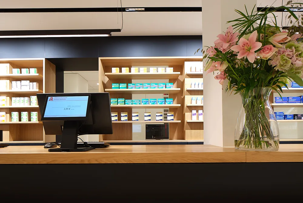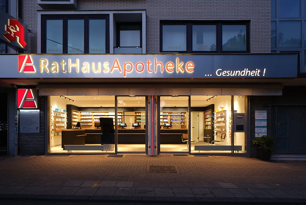 Die Rathaus Apotheke in Essen Bredeney wurde umfassend modernisiert und präsentiert sich heute mit einem klaren, offenen und transparenten Erscheinungsbild. Hochwertige Produkte und persönliche Beratung rücken in den Mittelpunkt.
